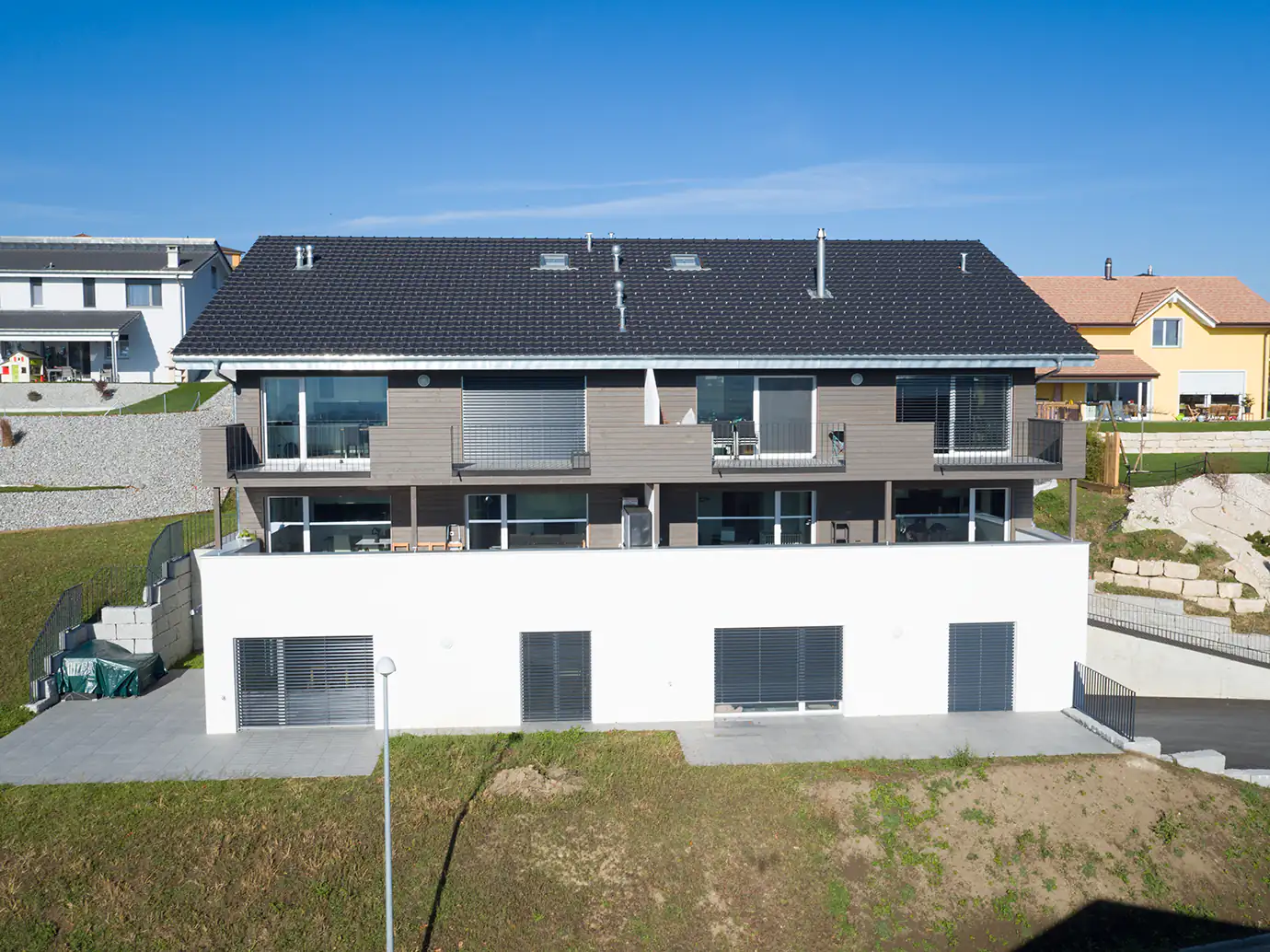 Cette parcelle est un véritable balcon avec vue sur les Préalpes et le Jura. Elle se situe entre une rangée de ferme d’exploitations agricoles et des nouvelles constructions de villas individuelles représentant des lignes et des surfaces à l’aspect contemporain. Cette expression se traduit par une hétérogénéité dans la nature des façades : dans la partie inférieure, le contemporain se traduit par une massivité et une rigidité qui laissent apparaitre dans sa partie supérieure un aspect léger et agraire.