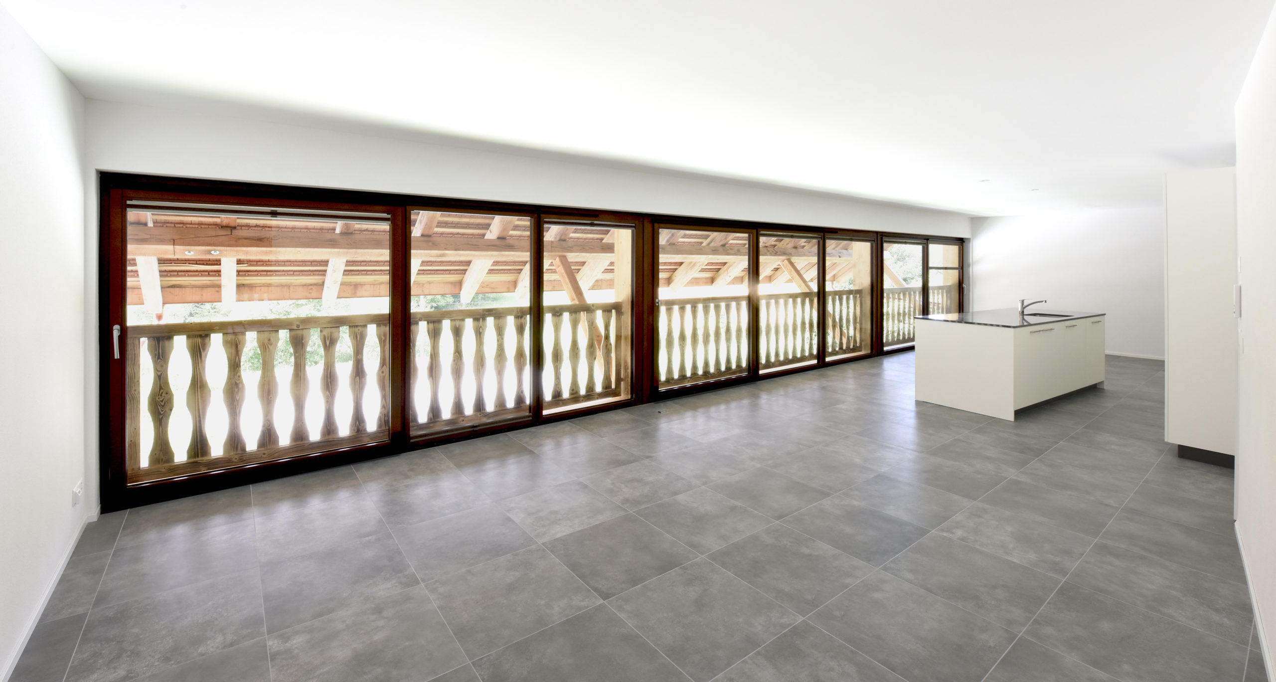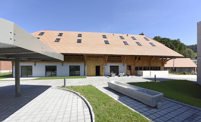 Le chauffage, par le sol et l’eau chaude sanitaire sont alimentés par une pompe à chaleur Air-Eau. L’isolation thermique a été mise en place sur la partie intérieure des murs extérieurs de la ferme afin de conserver l’aspect dur et compact de la molasse.