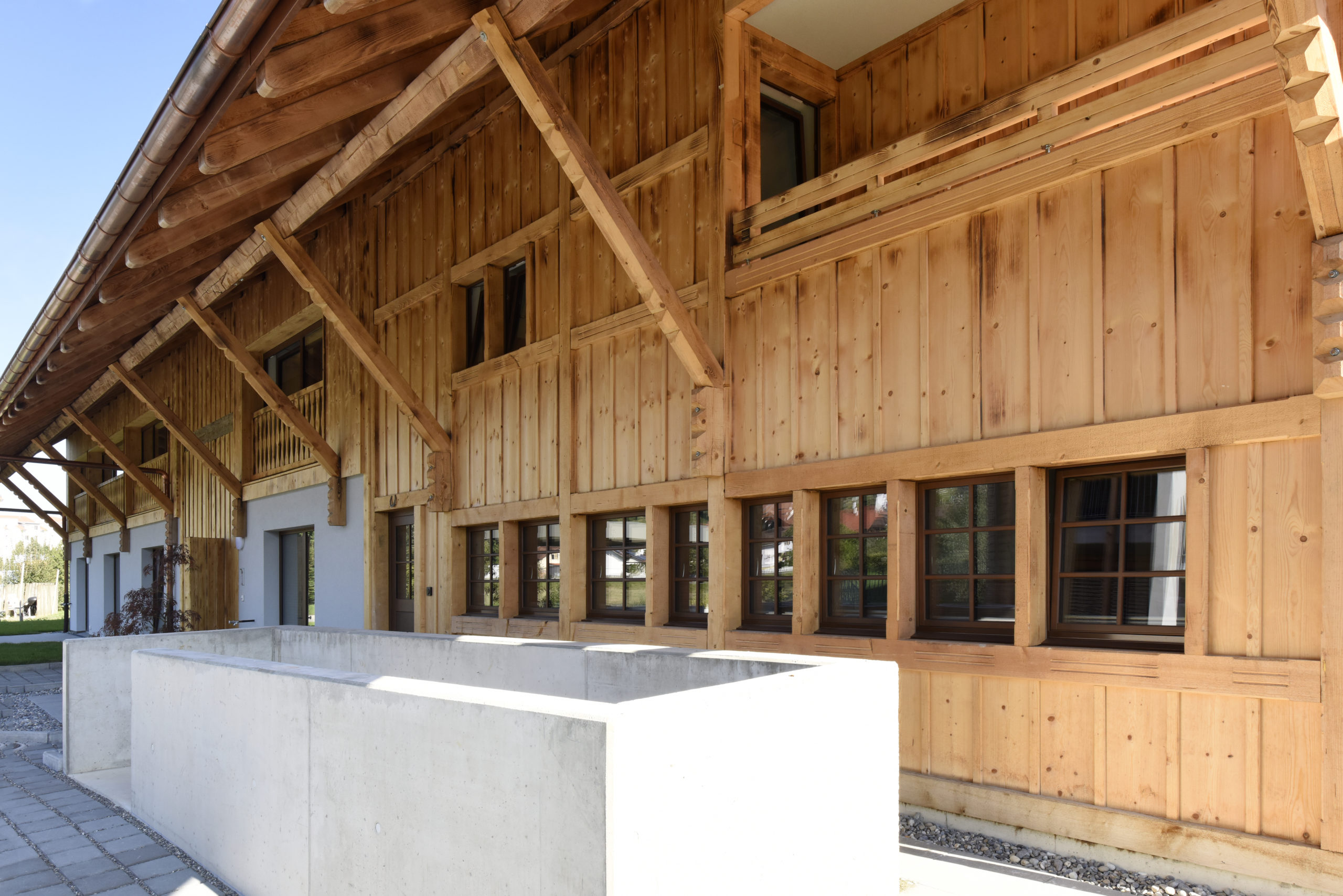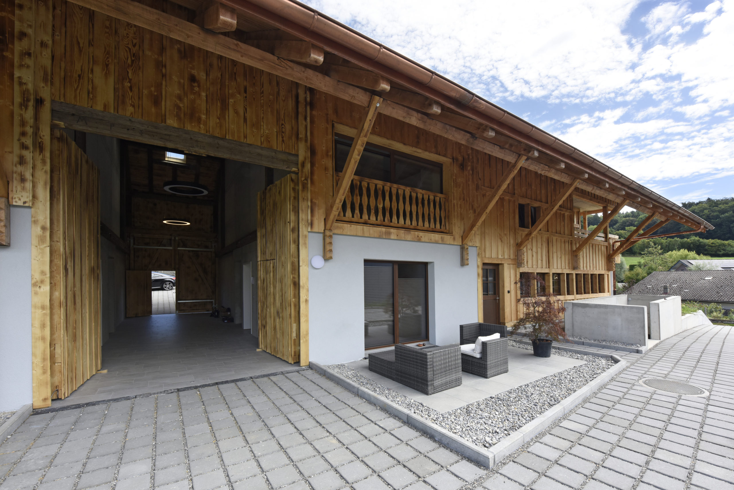 A l’extérieur, toutes les boiseries d’origine, y compris le balcon et la menuiserie extérieure de la partie habitable ont été reproduites à l’identique. Un crépi rustique revêt les partie inférieure des murs. La couverture reprend son aspect d’origine avec la réutilisation de tuiles en terre cute du pays.