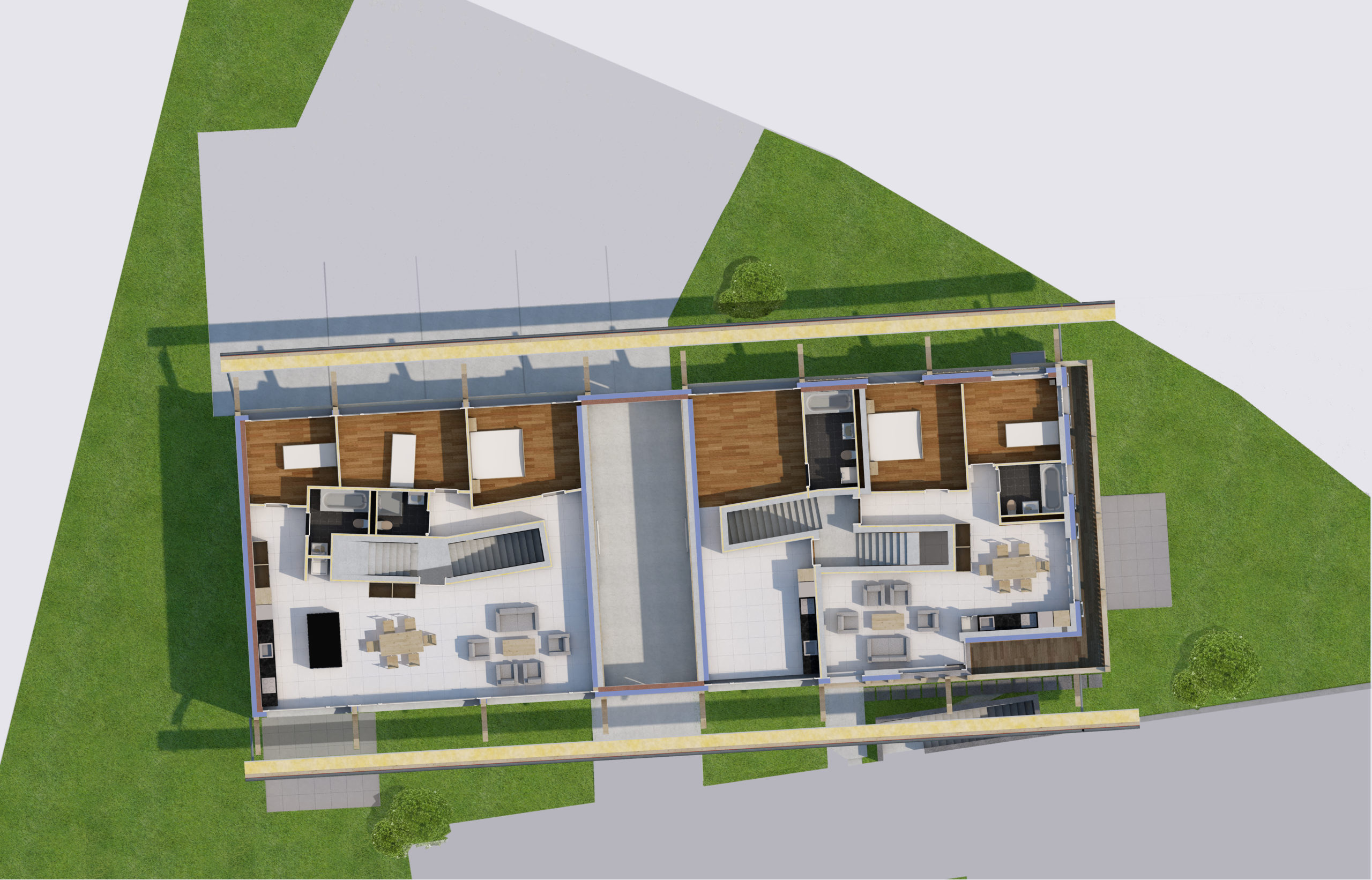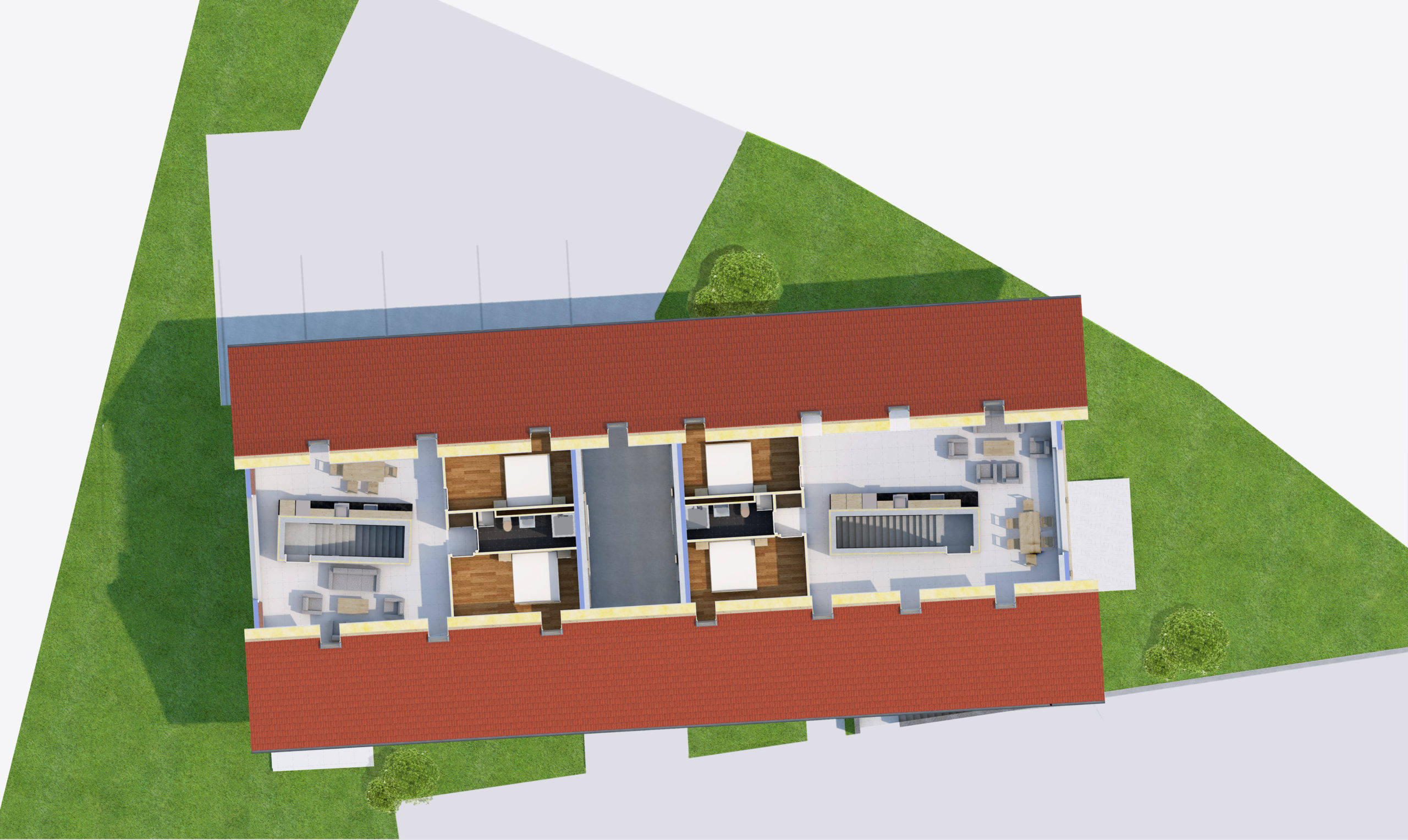 Au niveau des combles, les appartements ont été conçus sous forme de loft traversant, la structure porteuse a été maintenue dans l’idée de contraster avec la nouvelle volumétrie des espaces.